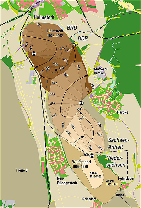 Historische Entwicklung des Braunkohleabbaugebiets direkt an der ehemaligen innerdeutschen Grenze zwischen Helmstedt und Harbke. Grafik: LMBV und Andreas Kadler post-mining & brownfields consulting.