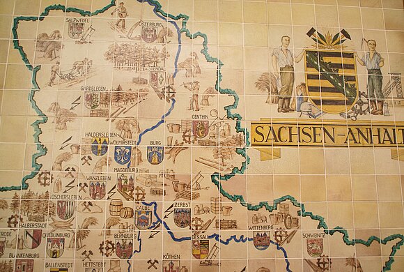 The tiled wall painting shows a former map of Saxony-Anhalt within its borders of 1947 with amateur performances of the emblems of district capitals, as well as the symbols of industries and professions. Photo: Stefanie Böhme