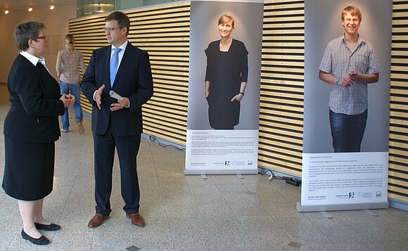Anmerkung:Intensives Gespräch am Rande der Ausstellungseröffnung: Landtagspräsident Detlef Gürth und Landesbischöfin Ilse Junkermann. Foto: Stefanie Böhme