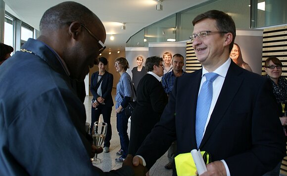 Anmerkung:Landtagspräsident Detlef Gürth und der Bischof von Tansania, Israel-Peter Mwakyolilie. Letzterer war vor allem von der guten Zusammenarbeit zwischen Landtag und Kirche – zum Wohle der Kinder und Jugendlichen – beeindruckt. Foto: Stefanie Böhme