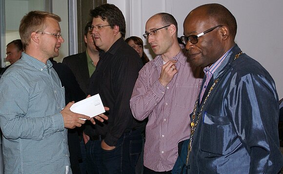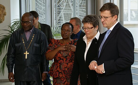 Anmerkung:Bei einem ersten Ausstellungsrundgang (v.r.n.l.): Landtagspräsident Detlef Gürth mit Landesbischöfin Ilse Junkermann sowie Kaluma und Israel-Peter Mwakyolilie, Bischof von Tansania. Foto: Stefanie Böhme