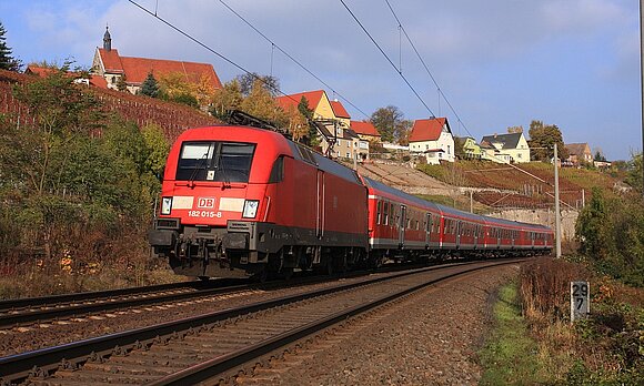 Regionalbahn mit E-Lok (Baureihe 182) auf der Strecke Halle–Erfurt–Eisenach bei der Vorbeifahrt am Weinberg Burgwerben. Foto: Deutsche Bahn AG/Jochen Schmidt