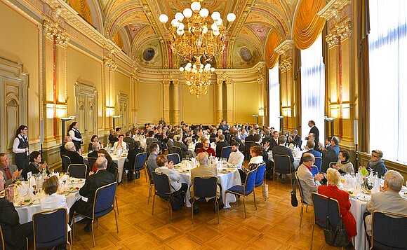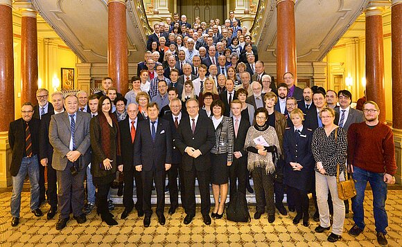Anmerkung:Hundert Ehrenamtliche waren zum Empfang in der Staatskanzlei eingeladen. Vorn in der Mitte die beiden Gastgeber: Landtagspräsident Dieter Steinecke (l.) und Ministerpräsident Dr. Reiner Haseloff. Foto: Fuchs