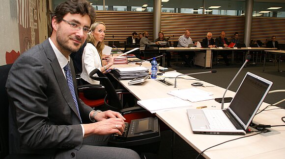 Landtagsstenograf Ringo Ulrich bei der Arbeit, hier stenografiert er eine Sitzung des Ausschusses für Wissenschaft und Wirtschaft. Foto: Stefanie Böhme