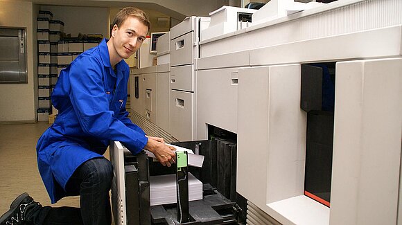 Einer der beiden Drucker des Hauses ist der 29-jährige Michael Neundorf. Der gelernte Offsetdrucker (also noch „alte Schule“) arbeitet seit 2010 im Landtag und hat auch sogleich die Antwort parat, warum der Landtag überhaupt eine eigene Druckerei braucht: „Viele Erzeugnisse werden in geringer Stückzahl produziert, da wäre es zu zeit- und kostenaufwendig, sie außerhalb herstellen zu lassen. Zudem sind wir eine On-Demand-Druckerei und reagieren schnell auf die Wünsche und Nöte aus dem Haus“, erklärt Michael Neundorf. „Ein nicht zu verachtendes Detail ist auch, dass eine Vielzahl der Drucksachen nicht für die Öffentlichkeit bestimmt sind und deswegen lieber gleich im Hause gedruckt werden.“