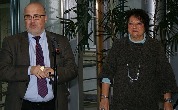 Anmerkung:Landtagsvizepräsident Gerhard Miesterfeldt und Künstlerin Rita Hilpert während der Eröffnungsworte zur Ausstellung im Landtag. Foto: Stefan Müller