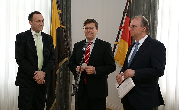 Anmerkung:Kleiner Empfang im Landtag für Kay Barthel, den neuen Präsidenten des Landesrechnungshofs. v.l.n.r.: Kay Barthel, Landtagspräsident Detlef Gürth und Ministerpräsident Dr. Reiner Haseloff. Foto: Stefanie Böhme