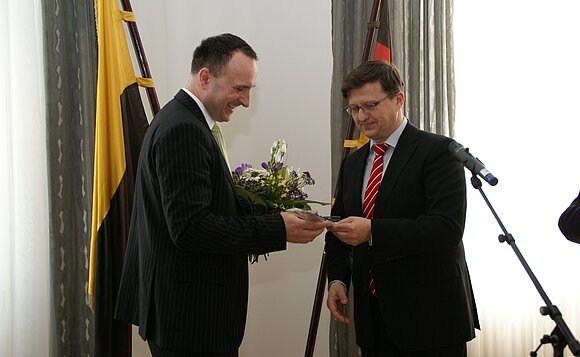 Anmerkung:Landtagspräsident Detlef Gürth (r.) übergibt dem neuen Präsidenten des Landesrechnungshofs, Kay Barthel, einen analogen Rechenschieber für seine neue Aufgabe. Foto: Stefanie Böhme