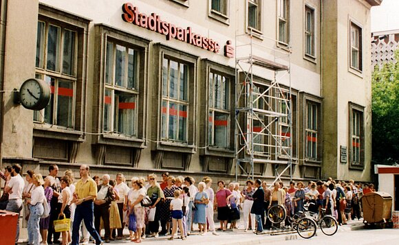 Anmerkung:Adieu Alu-Chip – Willkommen D-Mark! Clara Zetkin, Thomas Müntzer und, wer ihn hatte, Karl Marx verschwanden am 1. Juli 1990 aus den Portemonnaies der Menschen in der DDR. Die DDR-Mark wurde durch die D-Mark ersetzt. Foto: Sparkasse Magdeburg