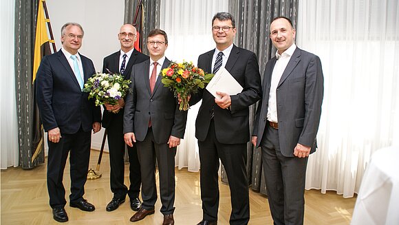 Bei der offiziellen Übergabe der Ernennungsurkunden zum Senat des Landrechnungshofs (LRH), v.l.n.r.: Ministerpräsident Dr. Reiner Haseloff, neuer Vizepräsident des LRH Rainer Elze, Landtagspräsident Detlef Gürth, neues Senatsmitglied im LRH Dietmar Weihrich und LRH Präsident Kay Barthel. Foto: Stefanie Böhme
