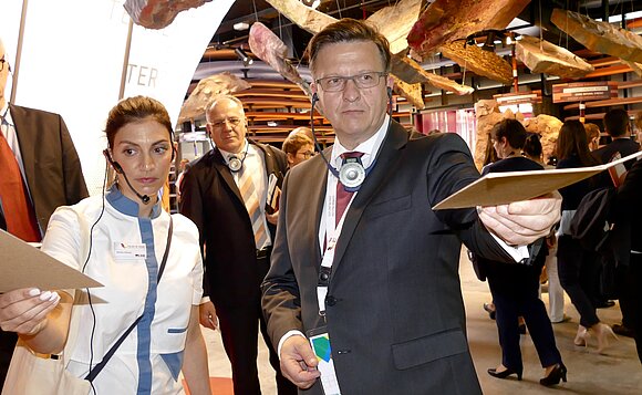 Anmerkung:Landtagspräsident Detlef Gürth entdeckt in Begleitung einer Mitarbeiterin des Deutschen Pavillons die Innovationen des World Wildlife Fund. Foto: Birgit Handke/IMG
