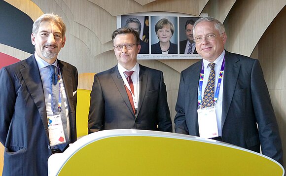 Anmerkung:Eintrag ins Goldene Buch des Deutschen Pavillons – v.l.n.r.: Präsident des Regionalrates der Lombardei Raffaele Cattaneo, Landtagspräsident Detlef Gürth, stellv. Generalkommissar des Deutschen Pavillon Peter von Wesendonk. Foto: Birgit Handke/IMG