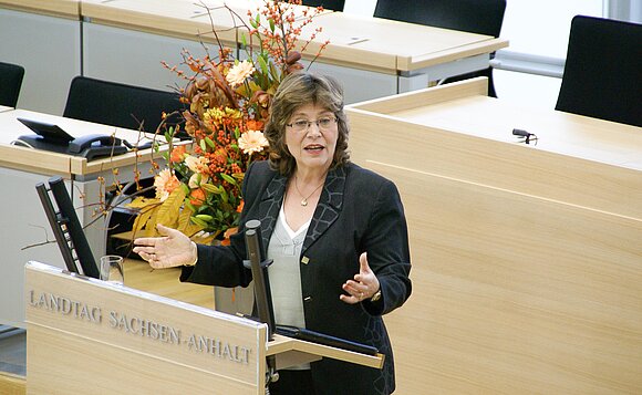 Prof. Dr. Claudia Dalbert, Fraktionsvorsitzende von BÜNDNIS 90/DIE GRÜNEN, blickte auf 25 Jahre Sachsen-Anhalt aus Sicht der Grünen zurück. Sie erinnerte an den ersten grünen Fraktionsvorsitzenden Hans-Jochen Tschiche und an das „grüne Gewissen des Landes“ Heidrun Heidecke, erste grüne Ministerin Ostdeutschlands in der Regierung Höppner. Vieles, was sich positiv auf die Entwicklung des Landes ausgewirkt habe, trage eine grüne Handschrift.