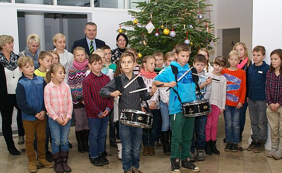 Anmerkung:Impressionen vom traditionellen Weihnachtsbaumschmücken im Landtag. In diesem Jahr mit Kindern aus der Grundschule Burgstall. Im Hintergrund: Landtagsvizepräsidentin Dr. Helga Paschke (5.v.l.) und Innenminister Holger Stahlknecht (4.v.l.). Foto: Stefanie Böhme