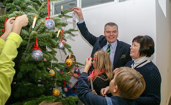 Anmerkung:Landtagsabgeordneter Sebastian Striegel hilft den Kleinen beim Anhängen der selbstgebastelten Kugeln. Foto: Stefanie Böhme