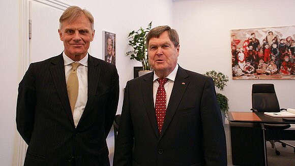 Landtagspräsident Dieter Steinecke (r.) begrüßte den neuen dänischen Botschafter in Deutschland, S.E. Friis Arne Petersen, im Landtag von Sachsen-Anhalt. Foto: Ursula Lüdkemeier.
