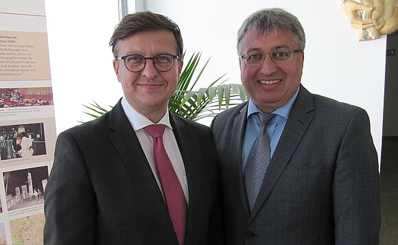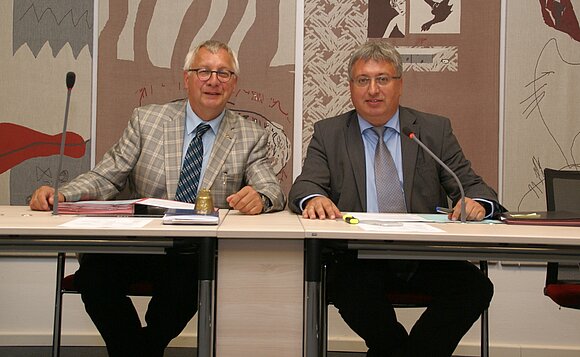Anmerkung:Der Ausschuss für Bundes- und Europaangelegenheiten sowie Medien konstituierte sich am 31. Mai 2016. Sein Vorsitzender ist der Abgeordnete Ralf Geisthardt (l.); hier zu sehen mit Landtagspräsident Hardy Peter Güssau. Foto: Stefanie Böhme