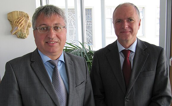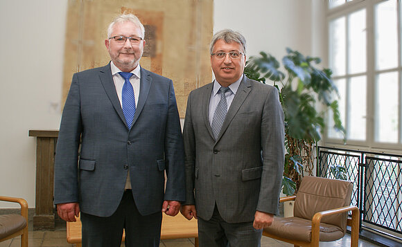 Anmerkung:Landtagspräsident Hardy Peter Güssau (r.) wünscht dem ehemaligen Landtagspräsidenten Detlef Gürth alles Gute für seine neue Aufgabe als Vorsitzender des Ausschusses für Recht, Verfassung und Gleichstellung. Foto: Stefan Müller