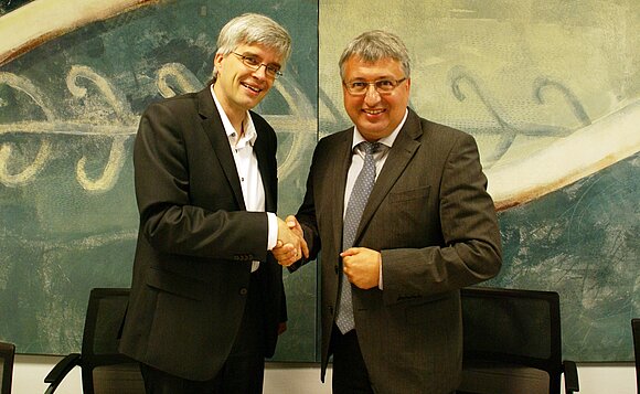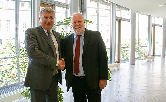 Anmerkung:Am Rande der Landtagssitzung, am 2. Juni 2016, hat sich der Ausschuss für Umwelt und Energie konstituiert. Landtagspräsident Hardy Peter Güssau (l.) wünschte dem Ausschussvorsitzenden Jürgen Barth (SPD) alles Gute für die Arbeit. Foto: Stefanie Böhme