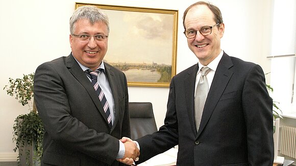 Landtagspräsident Hardy Peter Güssau (li.) begrüßte den britischen Botschafter Sir Sebastian Wood im Landtag in Magdeburg. Foto: Stefan Müller