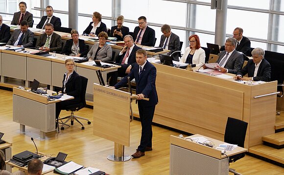 Ministerpräsident Dr. Reiner Haseloff hielt am Donnerstag, 2. Juni, seine erste Regierungserklärung in der 7. Legislaturperiode. Er stellte sie unter den Titel „Verlässlich, gerecht und nachhaltig – Kontinuität und neue Perspektiven für Sachsen-Anhalt“. Im Anschluss nahmen die Vertreter der Fraktionen Stellung zu den Aussagen des Ministerpräsidenten und brachten eigene Gesichtspunkte ein.