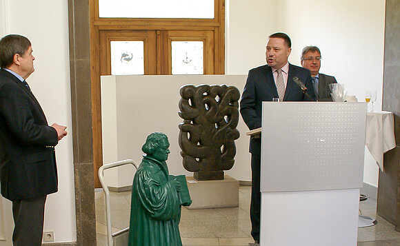 Ein gut ein Meter hohes Lutherstandbild begleitet Dieter Steinecke nun nach Hause – ein Geschenk seines Nachfolgers, das dem Protestanten Steinecke am Ende der Lutherdekade sehr gefallen hat. Glückwünsche erreichten ihn auch vom amtierenden Landtagsdirektor Dr. Torsten Gruß und Personalratschef Holger Busse. Landtagsvizepräsident Wulf Gallert hob noch einmal den Zuspruch für Dieter Steinecke im Wahlkreis und im Parlament hervor. Gerade in Ersterem seien er und Katrin Budde dem charismatischen Steinecke bei drei Landtagswahlen unterlegen gewesen.