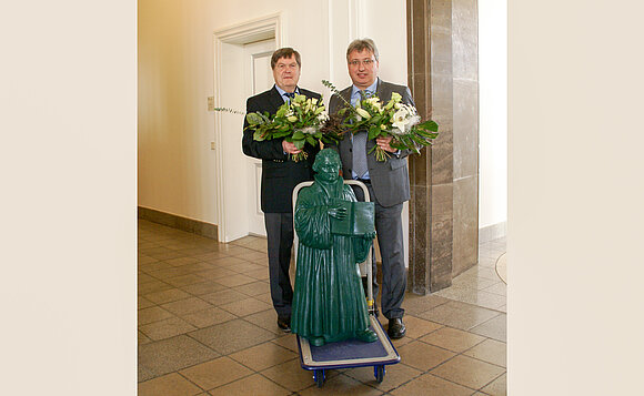 Anmerkung:Landtagspräsident Hardy Peter Güssau (r.) überreichte Landtagspräsident a. D. Dieter Steinecke (l.) eine Lutherstatue zum Abschied seiner Amtszeit. Foto: Stefanie Böhme