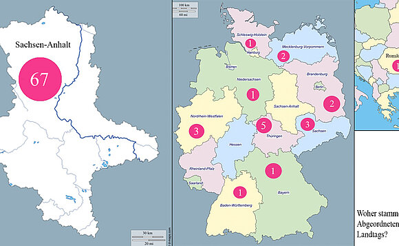 Anmerkung:So verteilen sich die Geburtsorte der Abgeordneten auf Sachsen-Anhalt, die übrigen deutschen Bundesländer und das Ausland. Grafik: Landtag