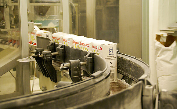 Anmerkung:Die Magdeburger Mühlenwerke arbeiten mit Unterstützung modernster Computertechnik. Ein hoher Grad an Automatisierung soll gleichbleibend hohe Qualität garantieren. Hier zu sehen, wie kleine handelsübliche Tüten mit Mehl gefüllt werden. Foto: Stefanie Böhme