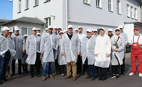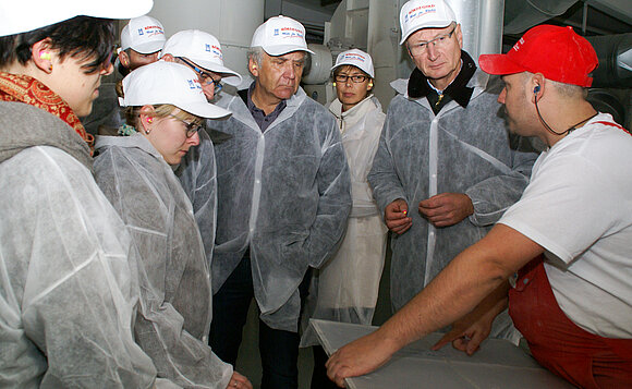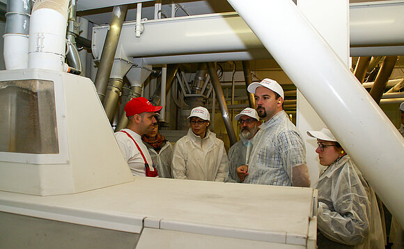Anmerkung:Der Ausschuss für Ernährung, Landwirtschaft und Forsten bei seinem Besuch in den Magdeburger Mühlenwerken. Auch für Abgeordnete galt aus hygienischen Gründen für den Rundgang eine besondere Kleiderordnung. Foto: Stefanie Böhme