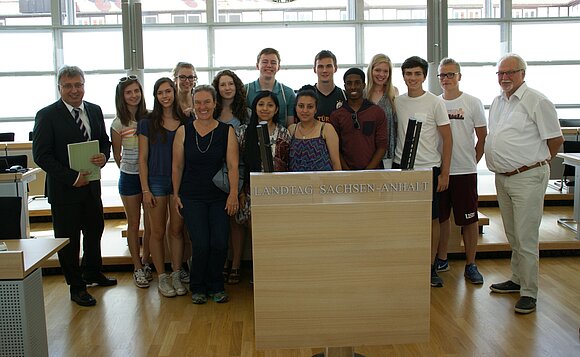 Auf ihrer Reise in die Partnerstadt Magdeburg besuchten elf Jugendliche aus Nashville auch das Parlament des Landes Sachsen-Anhalt. Nach einer Führung durch das Haus, bei der die Geschichte des Gebäudekomplexes und des Landtags an sich umrissen wurde, trafen sie im Plenarsaal mit Landtagspräsident Hardy Peter Güssau zusammen.