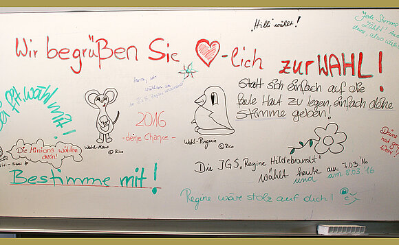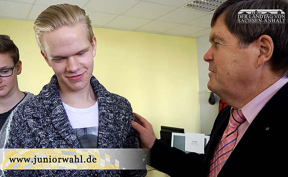 „Sei fit, wähl mit!“ oder: „Statt sich auf die faule Haut zu legen, einfach deine Stimme abgeben!“ Mit diesen und anderen Motivationssprüchen an der Tafel haben Schülerinnen und Schüler der IGS Regine Hildebrandt in Magdeburg zur Teilnahme an der Juniorwahl 2016 aufgerufen. Landtagspräsident Dieter Steinecke hat die Schirmherrschaft über das landesweite Schulprojekt übernommen und zeigte sich nach dem Besuch im Wahllokal der Schule begeistert: „Es ist toll zu sehen, mit welchem Elan die jungen Menschen bei der Sache sind.“ Seiner Ansicht nach sollten Jugendliche so früh wie möglich an die Themen „Wahlen“ und „Demokratie“ herangeführt werden. Steinecke sagte: „Es ist unsere wichtigste und vornehmste Aufgabe, zur Wahl zu gehen.“ Gleichzeitig appellierte er an die jungen Wähler: „Wählt demokratische Parteien, platte Sprüche ändern nichts zum Guten!“