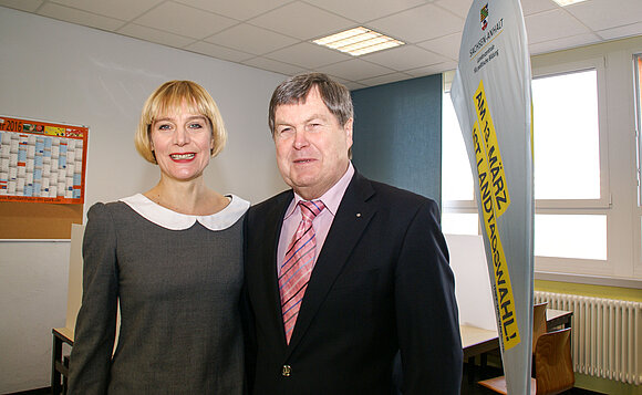 Anmerkung:Landtagspräsident Dieter Steinecke (r.) trifft „Frau Wahl“ bei der Juniorwahl 2016 in Magdeburg. Foto: Stefanie Böhme