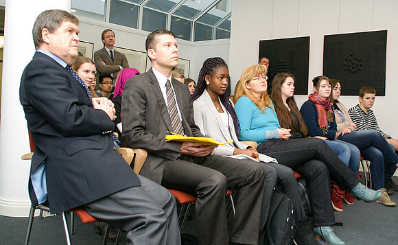 Anmerkung:Rund 30 Schülerinnen und Schüler aus Magdeburg waren zur Übergabe der „roten Hände“ ins Landtagsfoyer gekommen. Foto: Stefanie Böhme