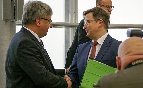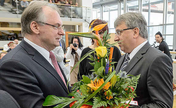 Anmerkung:Auch Ministerpräsident Dr. Reiner Haseloff (l.) gartulierte dem neuen Landtagspräsidenten. Foto: Jens Schlueter/ Landtag von Sachsen-Anhalt