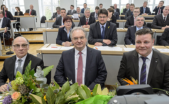 Anmerkung:Erleichterung beim alten und neuen Ministerpräsidenten Dr. Reiner Haseloff (M.): Im zweiten Wahlgang erreichte Haseloff 47 Ja-Stimmen, bei 34 Nein-Stimmen, drei Stimmenthaltungen und drei ungültigen Stimmzetteln und wurde damit wiedergewählt. Foto: Jens Schlüter/Landtag von Sachsen-Anhalt