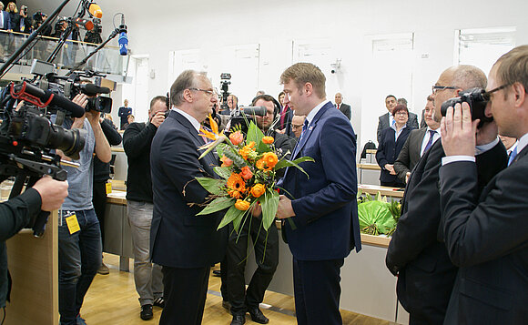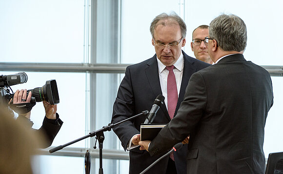 Anmerkung:Kurz nach der Wahl wurde Dr. Reiner Haseloff von Landtagspräsident Hardy Peter Güssau vor dem Landtag von Sachsen-Anhalt vereidigt. Foto: Jens Schlüter/Landtag von Sachsen-Anhalt