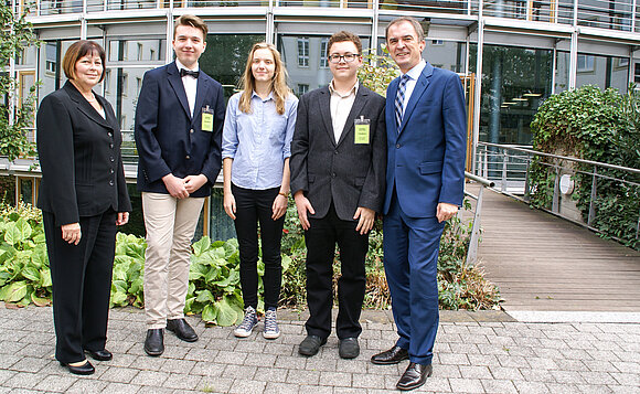 Anmerkung:Landtagspräsidentin Brakebusch zeigte sich stolz und beeindruckt von den Leistungen der jungen Forscher (v.l.: Christoph Griel, Corinna Specht, Bogdan Sergyeyev alle aus Halle) und dankte ihnen persönlich für ihr Engagement. Foto Stefanie Böhme