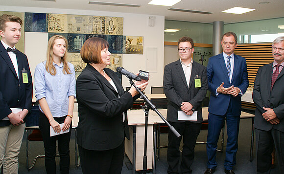 Landtagspräsidentin Gabriele Brakebusch hat am Rande der Landtagssitzung am 29. September 2016 die zehn Landessieger des Wettbewerbs „Jugend forscht“ geehrt. Gemeinsam mit dem Schirmherrn des Landeswettbewerbs, Bildungsminister Marco Tullner, würdigte Brakebusch bei einem kleinen Empfang die wissenschaftlichen Leistungen der jugendlichen Nachwuchsforscher. Eingeladen waren auch die Betreuungslehrer/innen sowie einige Vertreter von Unternehmen, die den Wettbewerb unterstützen.