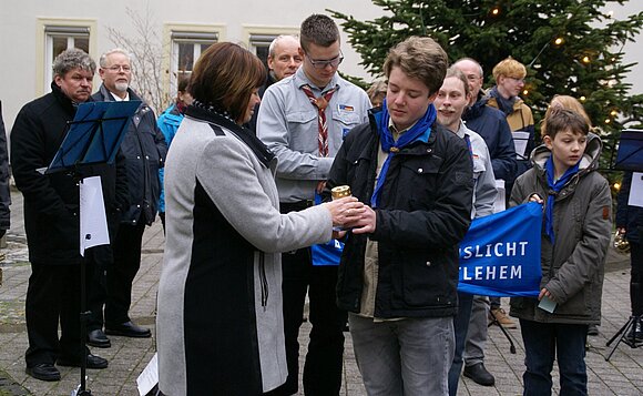 Im Rahmen des kleinen Konzerts überbrachte eine Gruppe von Pfadfinderinnen und Pfadfindern das diesjährige Friedenslicht. Landtagspräsidentin Gabriele Brakebusch nahm es dankbar entgegen und warb für die Verbreitung des mit dem Friedenslicht zusammenhängenden Wunsches nach Frieden auf der Welt.