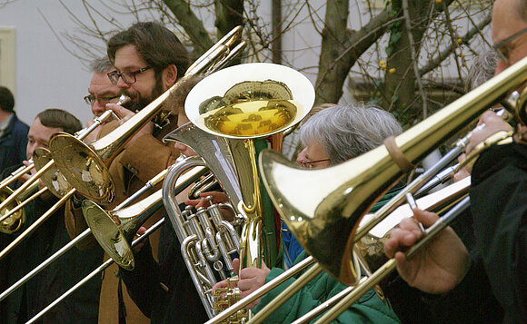 Anmerkung:Kleines Platzkonzert im Innenhof des Landtags mit dem Posaunenchor Köthener Blech und dem Dombläserensemble Magdeburg. Foto: Stefanie Böhme
