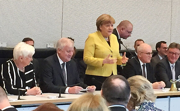 Anmerkung:Bundeskanzlerin Angela Merkel bei einem von zwei Zählappellen der CDU/CSU-Fraktion. Dort wurde geprüft, ob alle Wahlleute anwesend sind und das anvisierte Wahlergebnis zumindest theoretisch erreicht werden kann. Foto: Gabriele Brakebusch