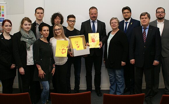 Aus Anlass des internationalen Aktionstags gegen den Einsatz von Kindersoldaten übergaben Schülerinnen und Schüler aus Sachsen-Anhalt am Mittwoch, 15. Februar 2017, Landtagsvizepräsidenten Wulf Gallert zahlreiche rote Handabdrücke.
