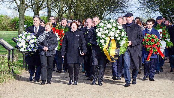 Auf dem Weg zum Ehrenfriedhof in Isenschnibbe: Landtagspräsidentin Gabriele Brakebusch (3.v.l.). Foto: Gesine Biermann