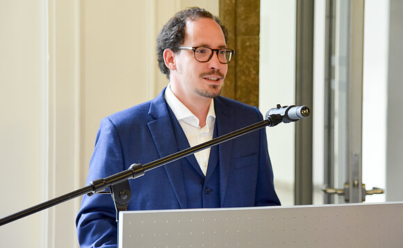 Anmerkung:Alexander Naß vom Trans-Inter-Aktiv Mitteldeutschland e. V. während seines Redebeitrags zur Ausstellungseröffnung. Foto: Stefan Müller