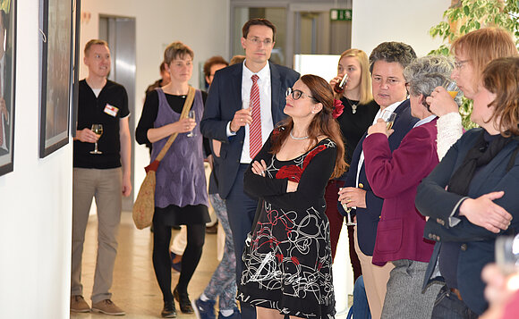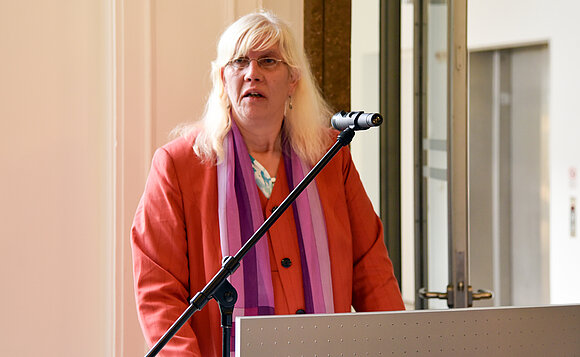 Anmerkung:Die Gleichstellungsbeauftragte der Otto-von-Guericke-Universität, Dr. Sandra Tiefel, während ihres Redebeitrags zur Ausstellungseröffnung. Foto: Stefan Müller