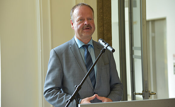 Anmerkung:Landtagsvizepräsident Wulf Gallert während seines Redebeitrags zur Ausstellungseröffnung. Foto: Stefan Müller