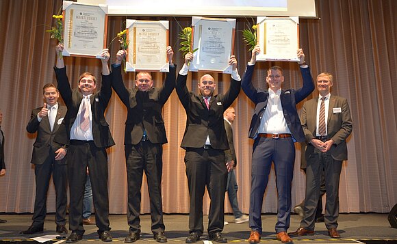 Anmerkung:Vier der frischgebackenen Handwerksmeister mit ihren Meisterbriefen. Foto: Handwerkskammer Magdeburg