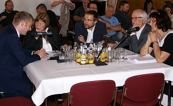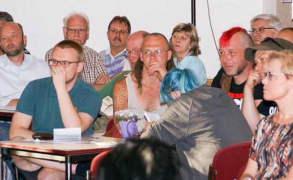 Anmerkung:Die Bürgerinnen und Bürger in Bitterfeld-Wolfen zeigten sich als interessierte Zuhörer, stellten aber im Sinne des Abends auch Fragen am Diskussionstisch. Foto: Stefan Müller