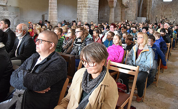 Anmerkung:Die Klosterkirche St. Vitus in Drübeck war bis auf den letzten Platz gefüllt. Schüler, Eltern, Lehrer und eingeladene Gäste feierten gemeinsam das 15. Namensjubiläum der Marianne-Buggenhagen-Schule. Foto. Stefanie Böhme
